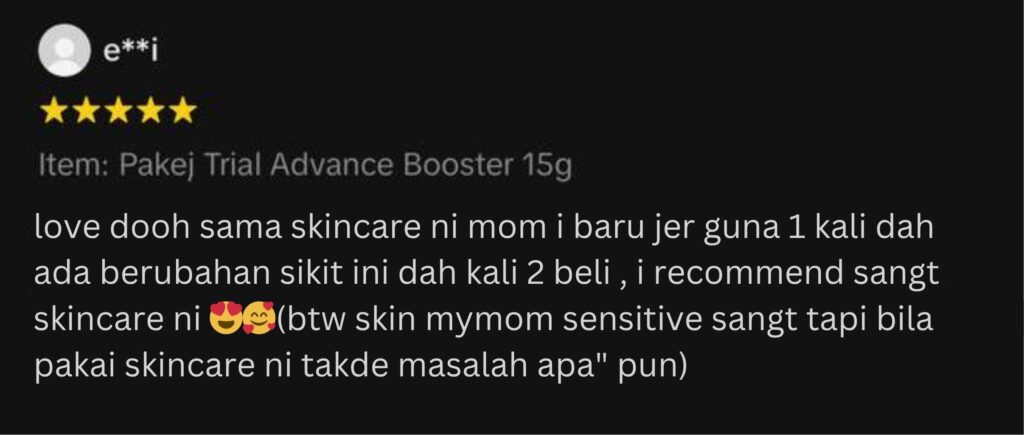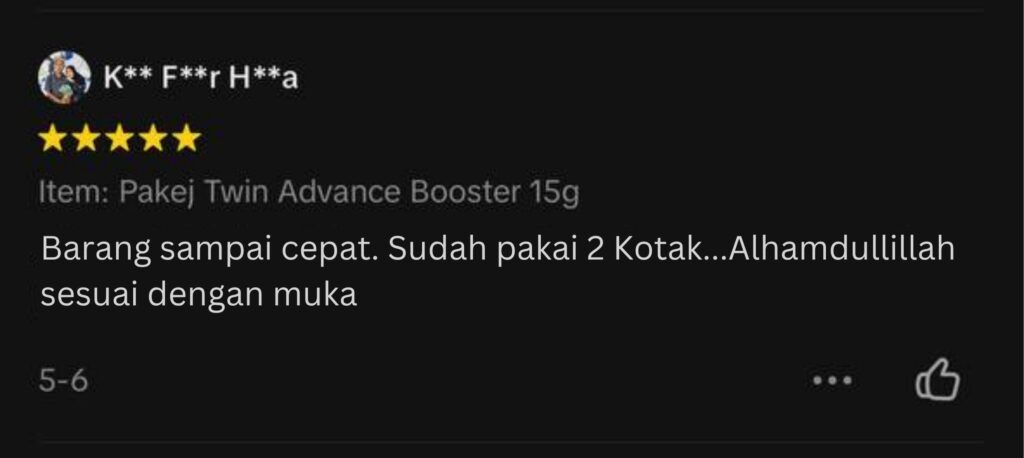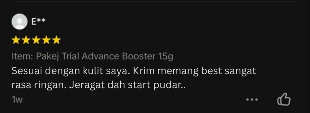 Alhamdulillah, setakat ini semua pelanggan Advance Booster sangat berpuas hati dengan kesan perubahan. Dengan formula gabungan 5 bahan premium ini, menjaminkan kulit akan cerah glowing semulajadi.